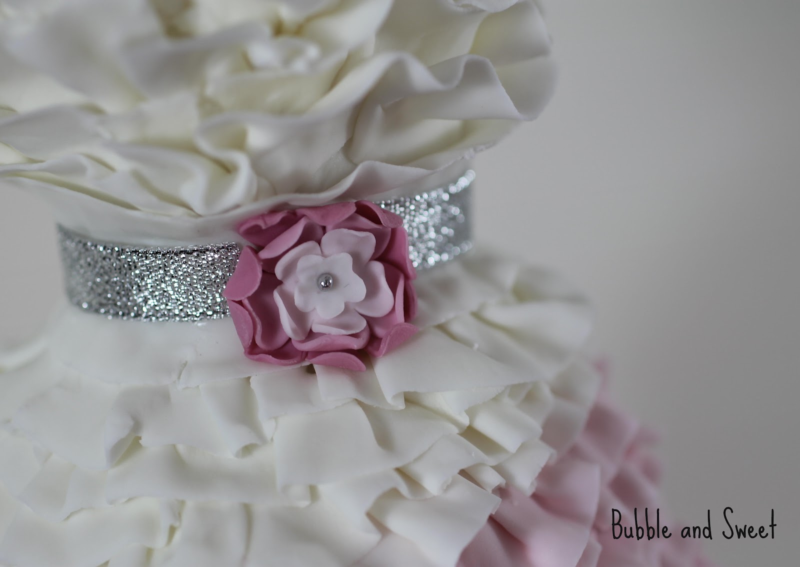 To get a full looking skirt I have in some sections added extra short lengths of ruffles ie. the ruffles did not circle the whole cake around they were only about 8 to 15cm(3 to 5 ") long.