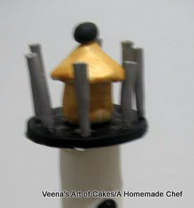 For the top of the tower. I used spaghetti to roll the small sticks. and shaped the house free hand out of gum paste. Then painted it with gold luster dust.