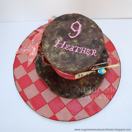 Alice In Wonderland font for the name and age. And made 2 dozen assorted "Eat Me" Petits Fours to go with the Hat Cake.