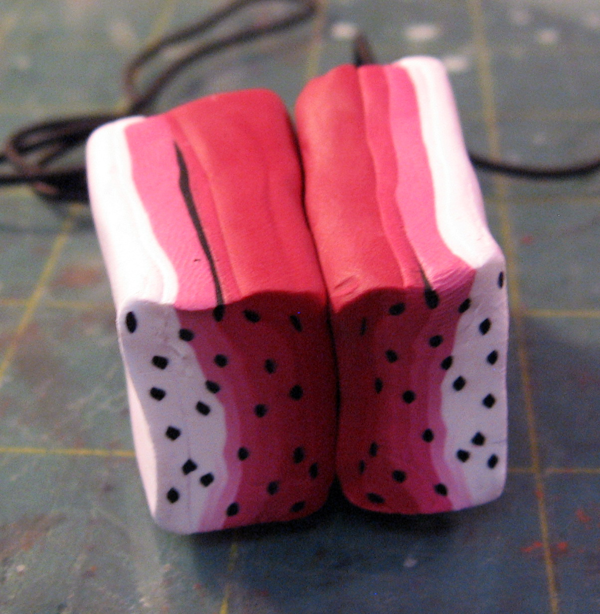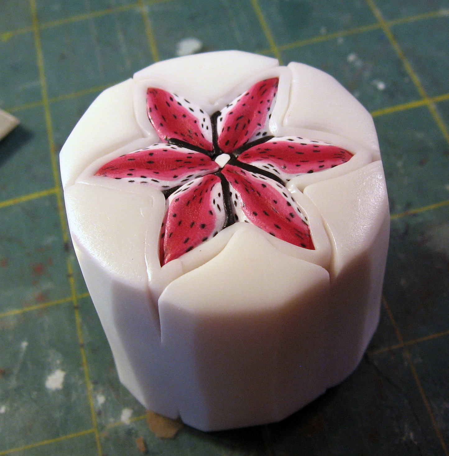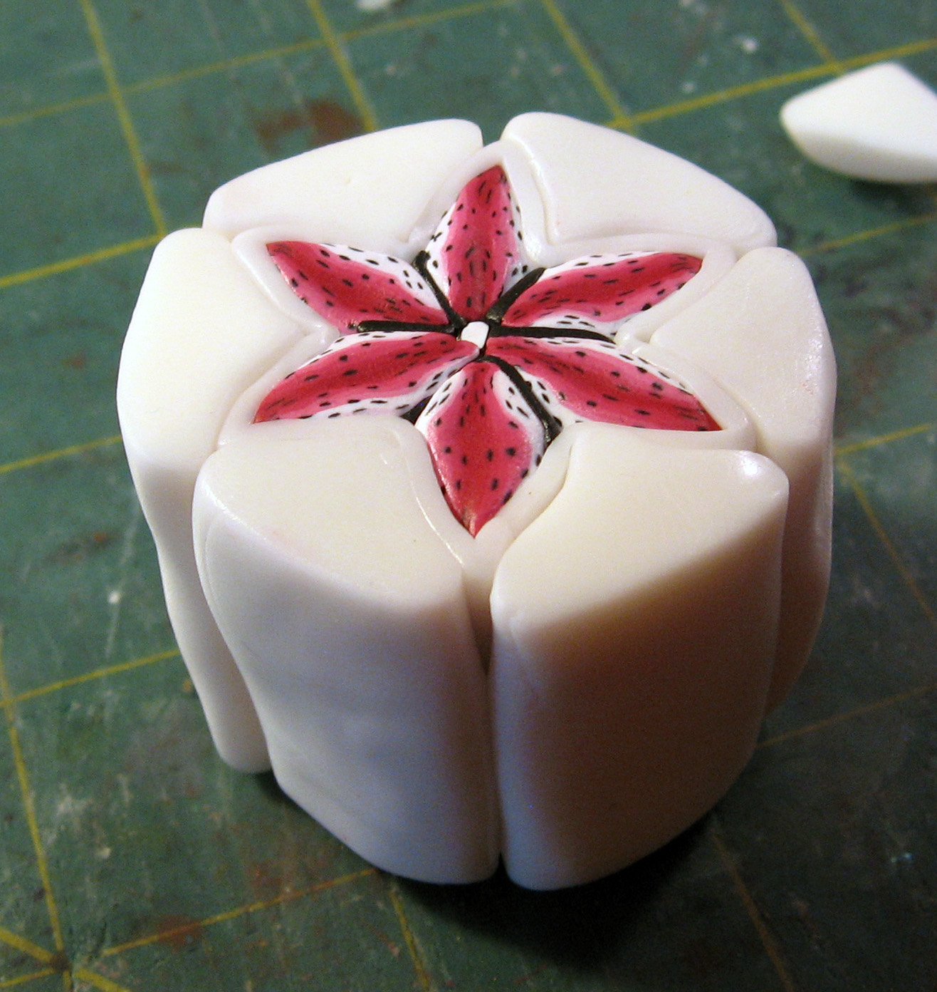 Add a really thin sheet of black clay to one half of one side of each petal as shown and set aside.