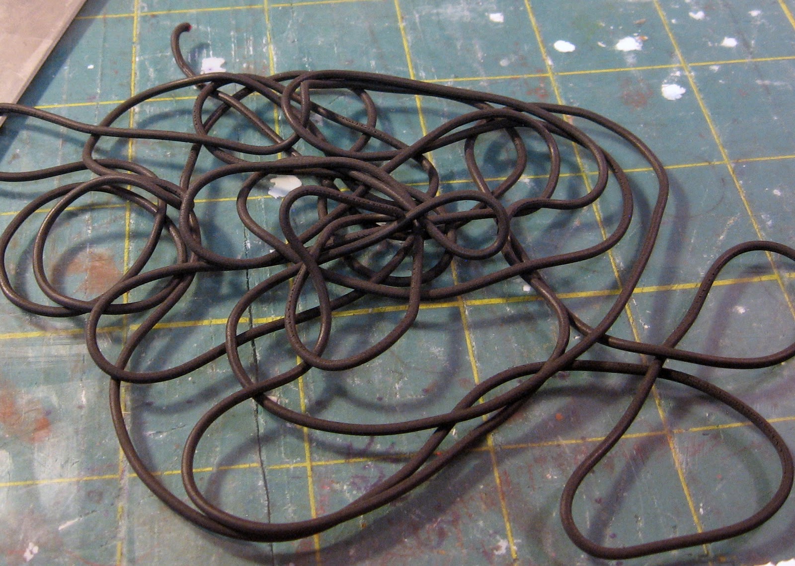 Keep folding the strip back and forth, accordion style, adding 2-4 black strings between layers, until you run out of strip.