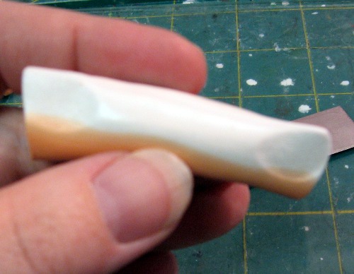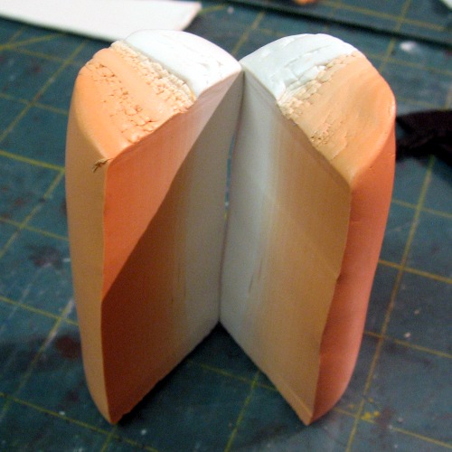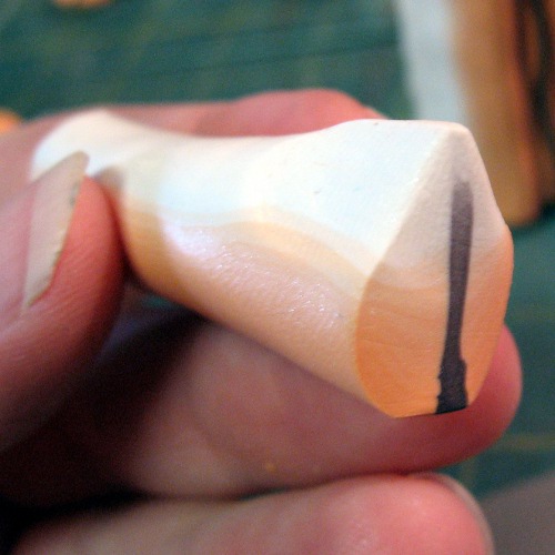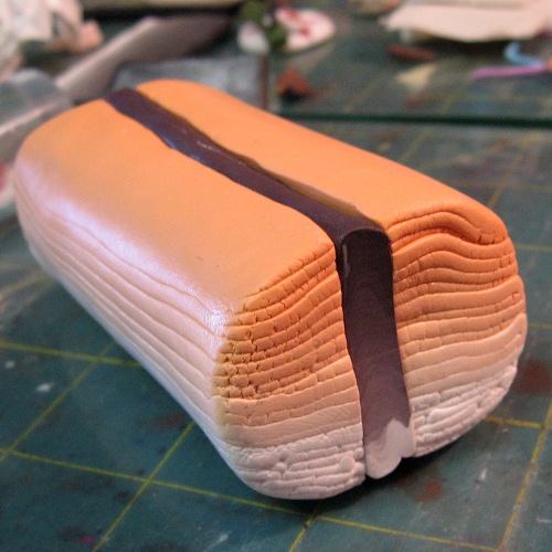 Compress and flatten the block into a flat strip. Try to make it the same size as the cut side of your orange log. (If you made this too big, you can make it longer and cut the end off.) This is going to be the stripe in your petal so the thicker it is, the fatter your stripe will be.
