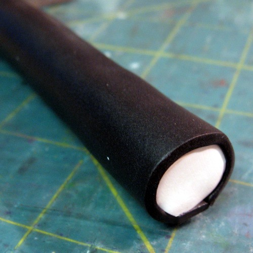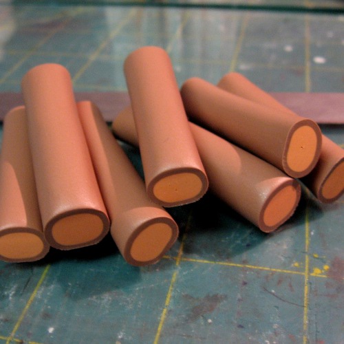 Now make a white log about 1/2 the diameter of your brown and orange center. Wrap a thin sheet of black clay around it. Reduce and cut into 12 pieces.