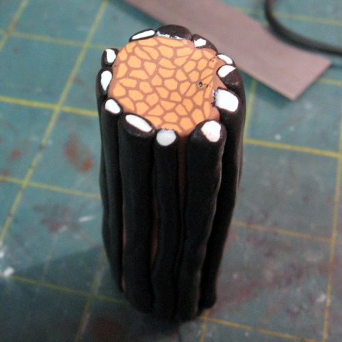 This is where you can really see the trouble I was having with the soft clay. Reduce the pieces as needed to the length of the center piece and arrange them around it. I gave up on getting them all the same diameter and just settled for getting them on there.