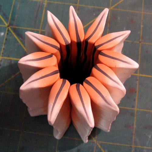 Keep shaping, squashing, pinching and stretching until you have a long skinny petal. Do this for all 12 of your segments. Stand them up on the work surface in a circle with a hole in the middle. This is why we did the petals first instead of the center. Now you can see about how big your center needs to be.