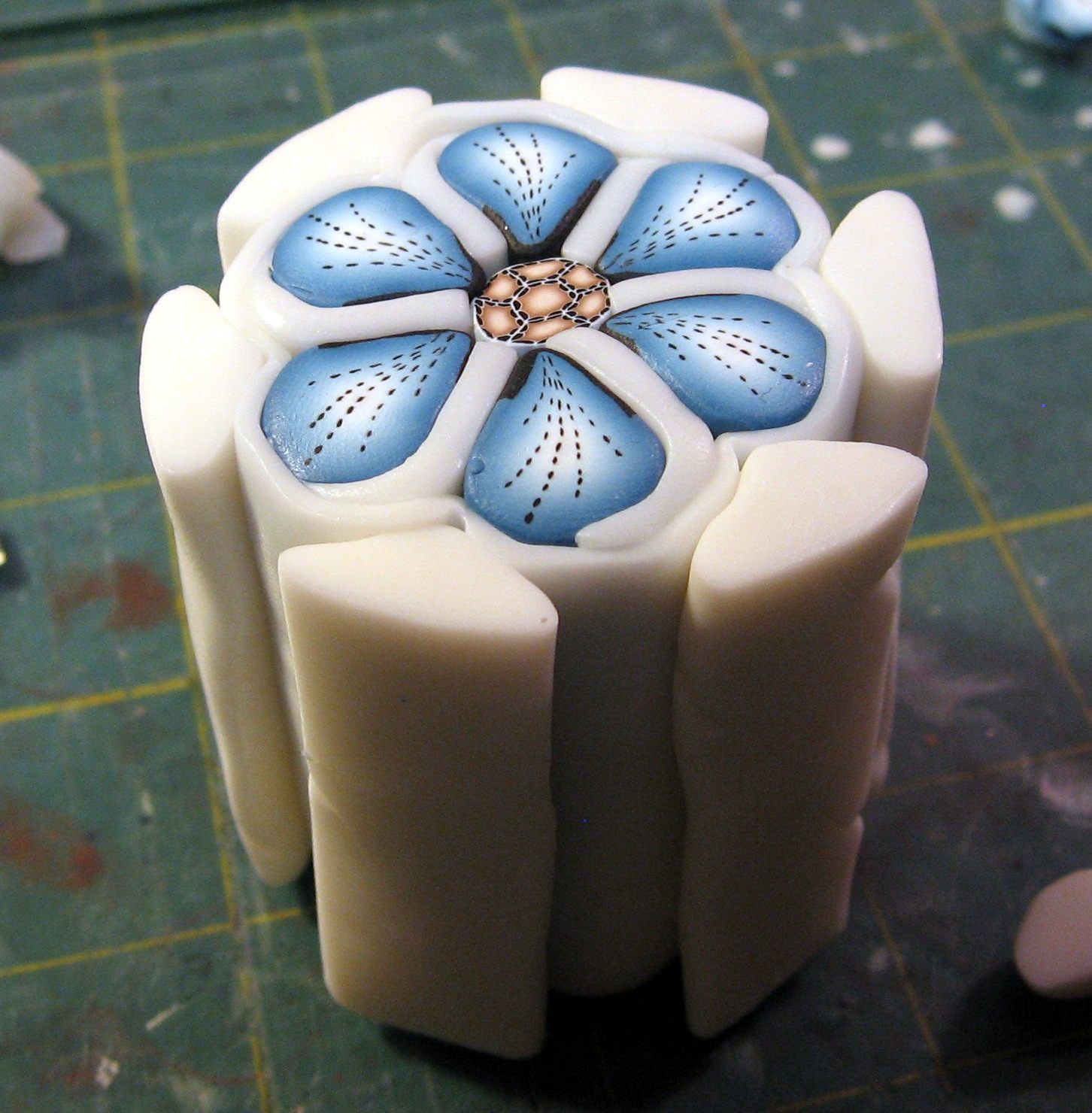 Add a thick sheet of trans clay between each petal and place them around the center cane. Make sure the trans hangs out a ways so you can trim it. (See the next photo.)