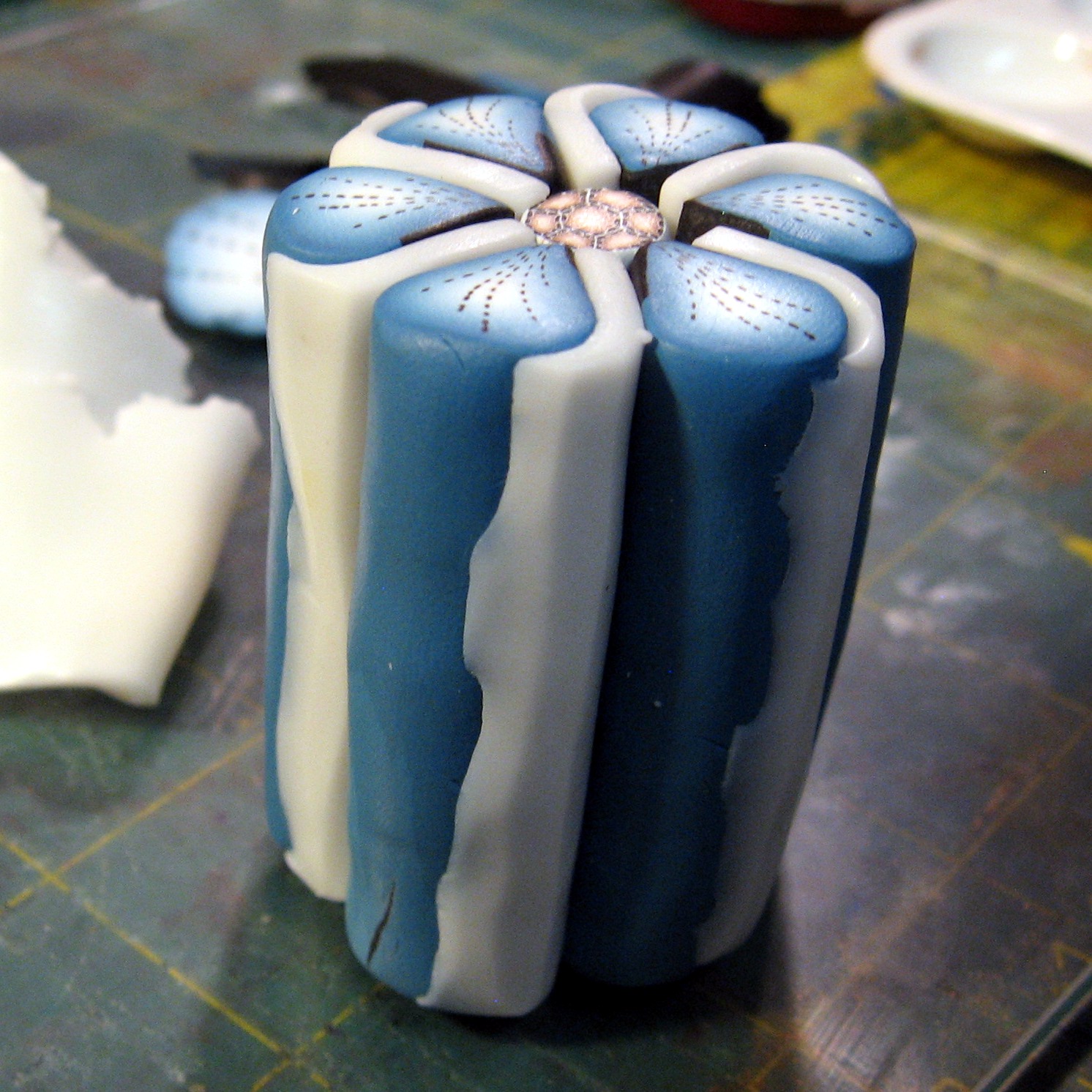 Looking straight down on the cane, trim away the excess clay of the wedges. Shaving off a little at a time is better than trying to get it all at once. If your blade is flexible, you can curve it a little to help with the shaving. The idea is to get the cane as round as you can