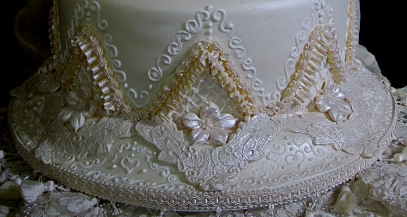 I added pressed lace pieces below the lattice, piped a ruffle with a shell on top of that, used a pressed flower petunia (you can get the lace piece and petunia cutter/veiner from Jennifer Dontz's Sugar Delites. I piped royal icing details and used luster dust to bring out a pearl sheen to the board. I added a piece of tasseled gimp to the edge of the board to finish it off.