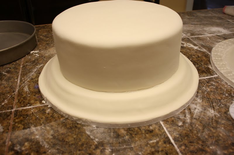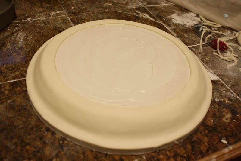 The bottom cake was a 12" cake that was on a 1/2 piece of foam core board cut to the exact size of the cake. Make a batch of royal icing (I think you could use chocolate in the cooler months or even buttercream to do this with.)