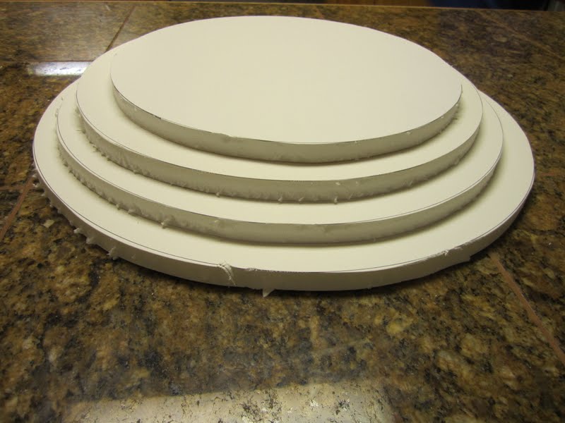 Dab Royal Icing on the bottom board and add the next size to the top of it and then do the same to the next board. Let dry til set.